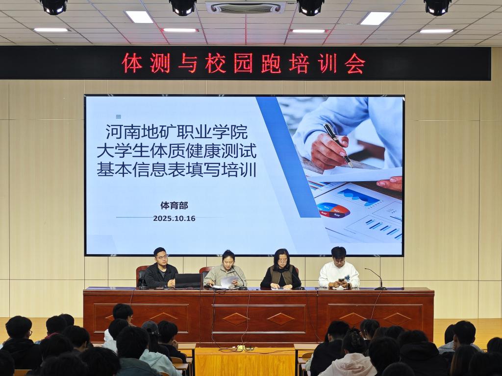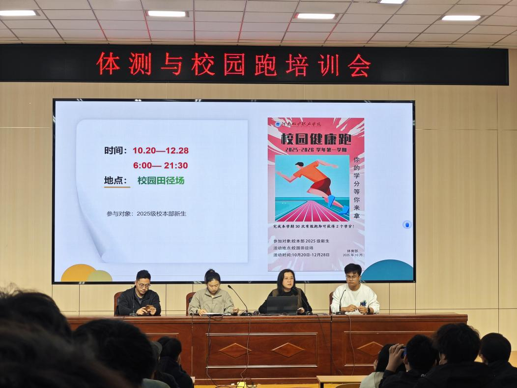为深入贯彻落实习近平总书记关于“促进青少年身心健康、强健体魄”的指示精神,切实推进《国家学生体质健康标准》等级证书制度落地实施,确保2025级新生“活力奔跑 友谊花开”校园健康跑活动顺利开展,我校体育部于10月16日在一号教学楼合堂一组织开展AI体测系统与健康跑专项培训会议。各二级学院2025级新生班级班长、体育委员及相关体育教师参加了本次培训。