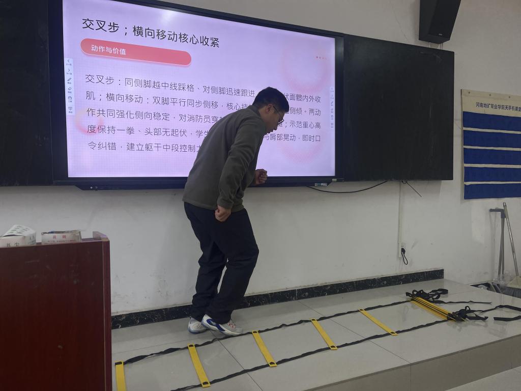 贾越、吴迪迪、杨凯凯三位青年教师根据应急产业学院学生的专业特点,分别围绕绳梯基本训练、平衡木控制练习和双手头上前掷实心球教学内容进行无生课堂教学展示。在学情分析、教学目标以及课程设计阐述环节,三位教师均展现出了对该专业学生体能训练需求的深刻理解。他们巧妙地将应急安全救援技能需求融入体育教学中,通过生动的示范和详细的讲解,展现了创新的教学方法和扎实的专业功底。