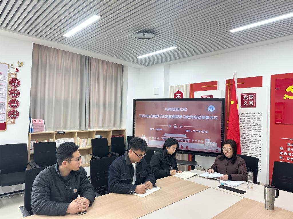 3月6日,体育部直属党支部召开党员大会,专题部署树立和践行正确政绩观学习教育工作,全体党员和入党积极分子贾越参加会议。会议传达学校党委关于开展学习教育的部署要求,深刻阐释树立和践行正确政绩观的重大意义,明确以“立党为公、为民造福、科学决策、真抓实干”为总要求,一体推进学习研讨、问题查摆、整改整治、建章立制、开门教育等重点任务。会议强调,要提高政治站位,把学习教育与体育教学、赛事组织、师生服务等工作深度融合,坚持学查改贯通,力戒形式主义,切实把学习成果转化为推动部门高质量发展、服务立德树人根本任务的实际成效,确保学习教育走深走实、见行见效。